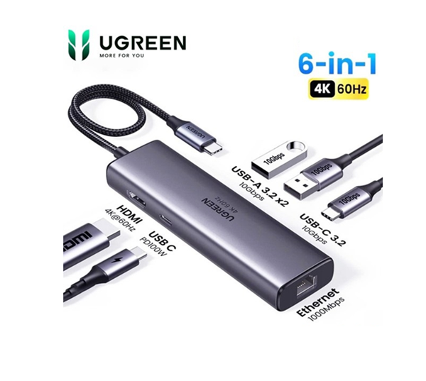 Thiết bị mở rộng USB Type-C 6 in 1 HDMI 4K@60Hz Ugreen 45000 là giải pháp hoàn hảo giúp mở rộng cổng kết nối cho laptop, MacBook, máy tính bảng và điện thoại hỗ trợ USB-C, tích hợp cổng HDMI 4K@60Hz, USB 3.0, LAN Gigabit và sạc nhanh PD 100W