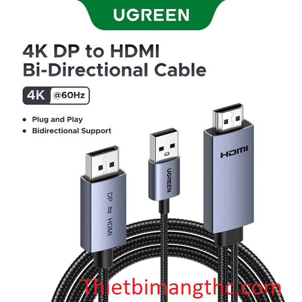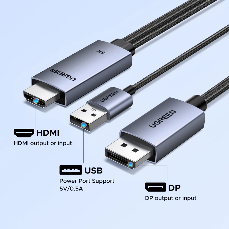 Cáp hai chiều UGREEN 4K DP sang HDMI với cáp sạc USB Độ phân giải cao với vỏ nhôm và tay áo bện dài 1M/2M