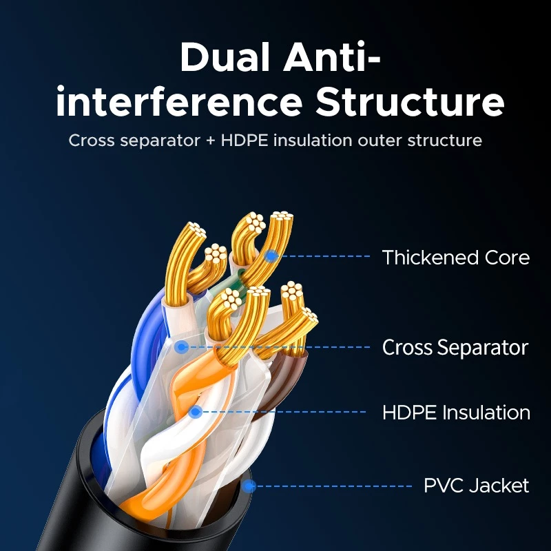Chống nhiễu hiệu quả: Cấu tạo lõi đồng nguyên chất cùng cấu trúc xoắn đôi giúp giảm thiểu nhiễu điện từ (EMI) và nhiễu chéo (Crosstalk), đảm bảo tín hiệu luôn liền mạch.