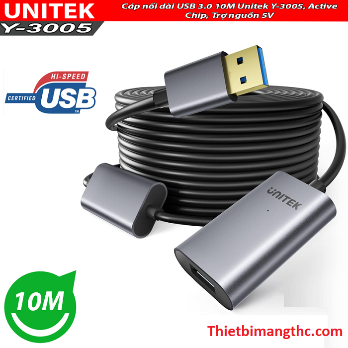 Thông số kỹ thuật : Cáp nối dài USB 3.0 dài 10M Unitek Y-3005, Active Chip, Trợ nguồn 5V cao cấp