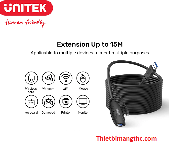 Thông số kỹ thuật : Dây, cáp USB 3.0 nối dài 15m có IC khuếch đại hỗ trợ cổng cấp nguồn Unitek Y-3003 cao cấp
