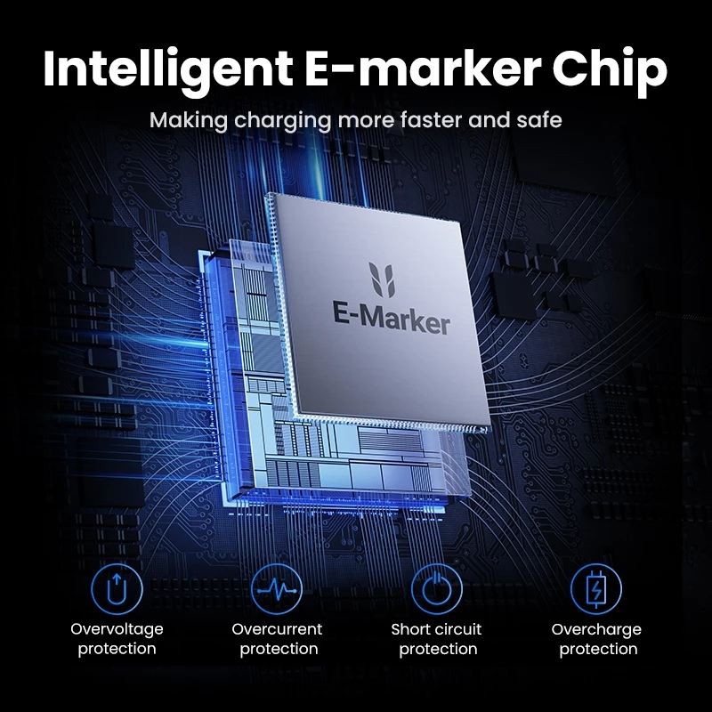 Chip E-Marker thông minh: Chip tích hợp bên trong giúp cáp tự động điều chỉnh dòng điện phù hợp với thiết bị, bảo vệ pin và tối ưu hóa tốc độ sạc.