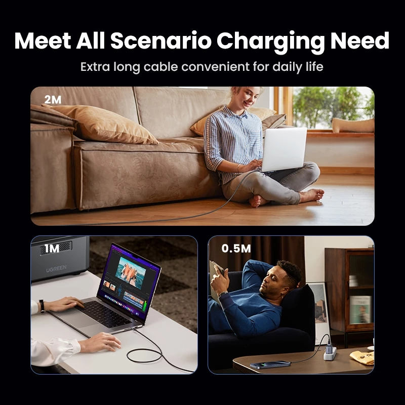 Hỗ trợ sạc siêu tốc 240W: Cáp sạc Ugreen 45068 hỗ trợ công nghệ sạc nhanh PD3.1/PPS với công suất tối đa 240W (48V/5A), giúp sạc đầy pin cho các dòng laptop công suất lớn như MacBook Pro một cách nhanh chóng. Cáp cũng tương thích với nhiều mức công suất khác như 100W, 60W, 45W, v.v., phù hợp với nhiều thiết bị.
