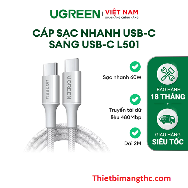 Cáp sạc nhanh USB-C sang USB-C PD 60W (20V/3A) dài 2M Ugreen L501 65248 (Titan) cao cấp