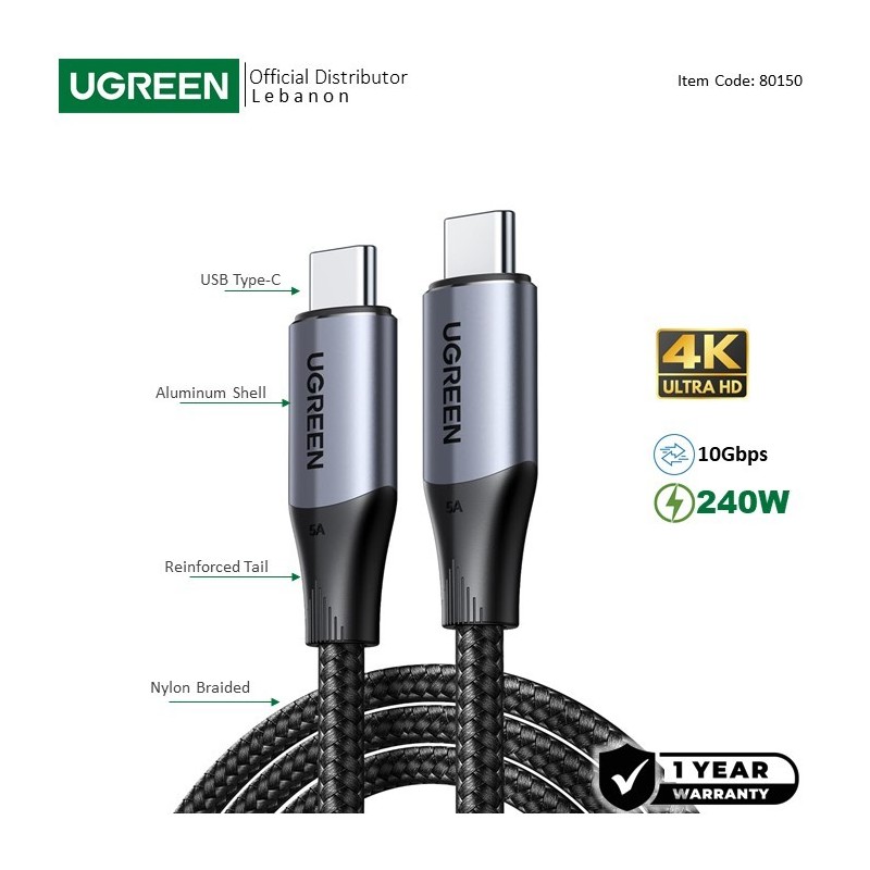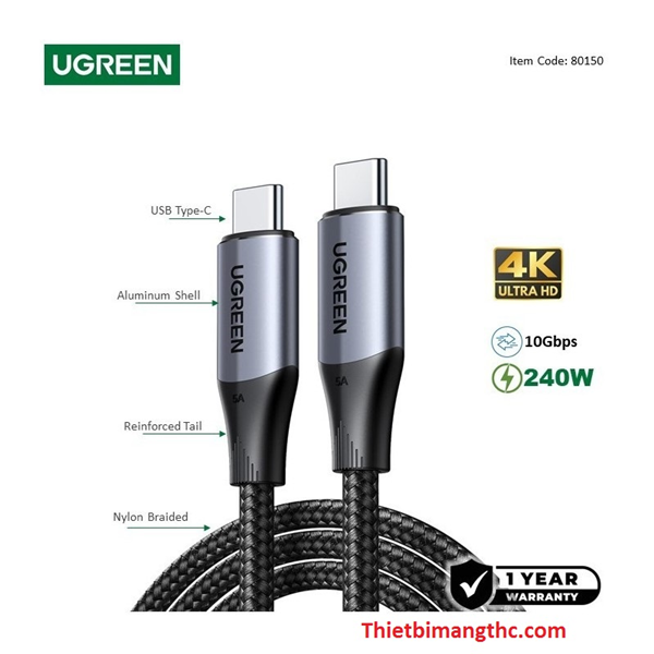 Cáp USB Type C 3.2 Gen 2 dài 1M Ugreen 80150, Hỗ trợ hình ảnh 4K@60Hz, 240W, 10Gbps cao cấp