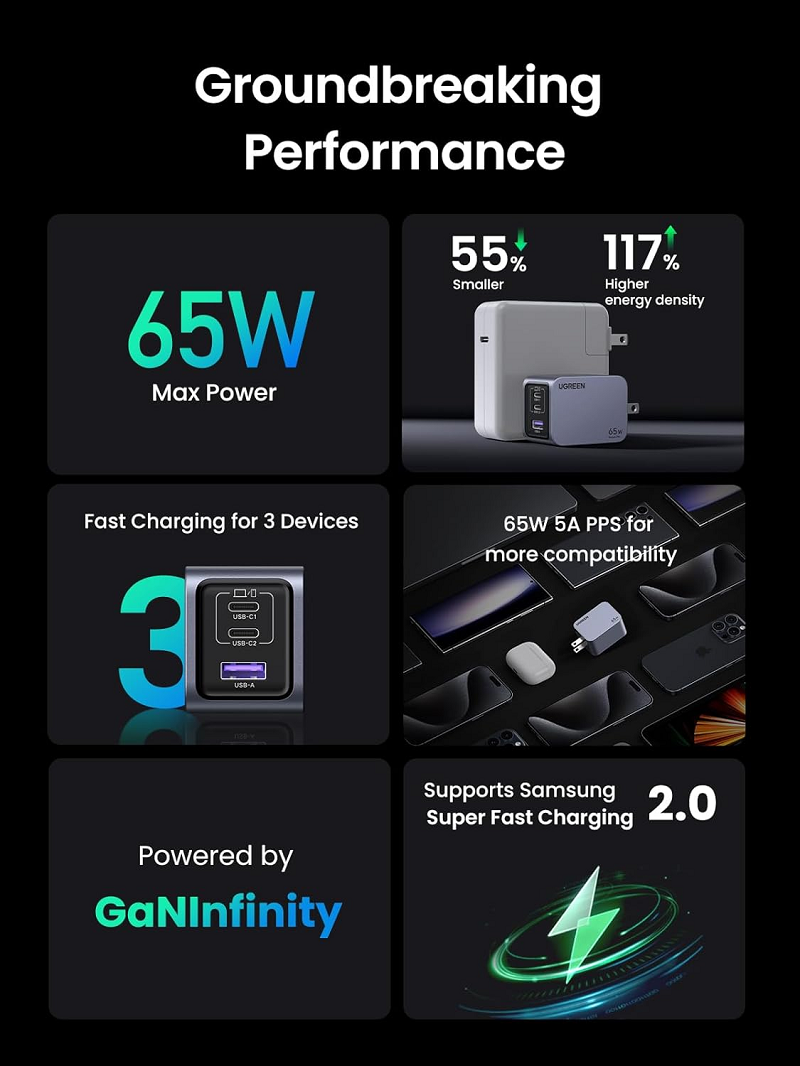 Công suất tối đa 65W – hỗ trợ sạc nhanh PD 3.0, QC 4.0/3.0, PPS cho iPhone, iPad, MacBook Air, Samsung, Xiaomi và nhiều thiết bị khác.