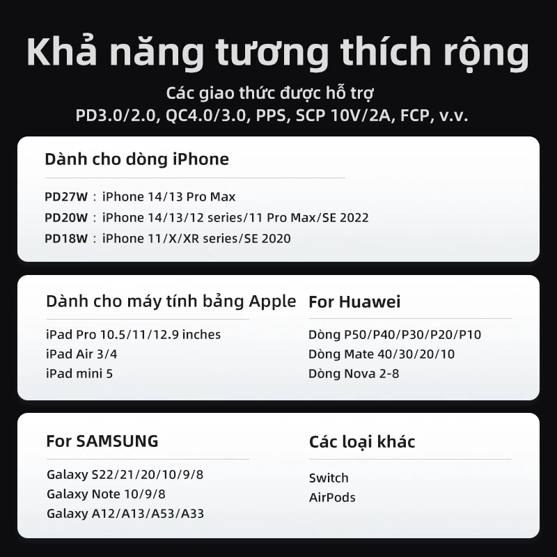 Hỗ trợ: PD3.0/2.0, PPS, QC4.0/3.0/2.0, AFC, SCP, FCP.