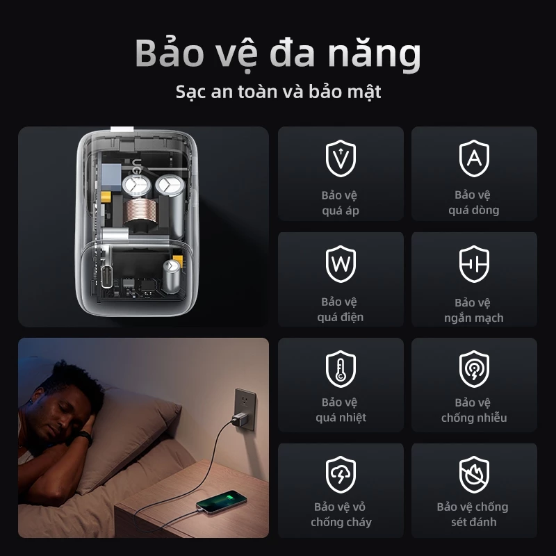 Bên cạnh hiệu năng vượt trội, Củ sạc nhanh Nexode Mini 30W GaN cổng USB-C Ugreen 55530/X513 hàng cao cấp còn được trang bị hệ thống bảo vệ an toàn đa lớp: chống quá dòng, quá áp, quá nhiệt và đoản mạch, giúp bảo vệ thiết bị tối ưu và kéo dài tuổi thọ pin.